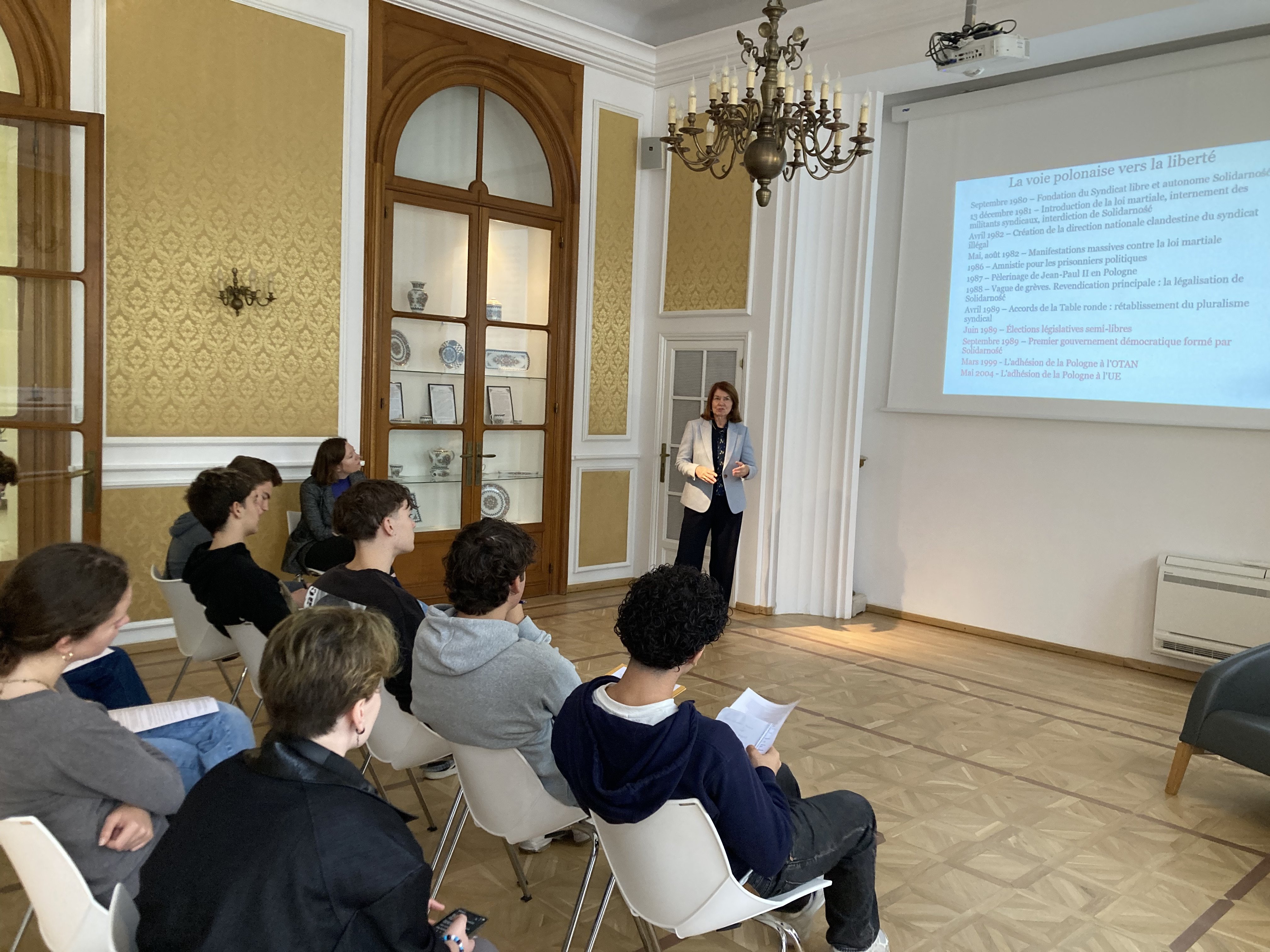 On the very last day where school trips for the S7 were allowed, the S7Hi2DEA chose to go on a trip with their history class and visited the Polish Embassy and the House of European History in Brussels. In the beginning the class had the honour to be welcomed by the chargé d’affaires of Poland at the embassy. The chargé d’affaires, Ms Katarzyna Skórzyńska, shared with us her memories of the 1980s and the Solidarność movement, when the Polish people fought against communism and achieved thus to overcome soviet suppression and install freedom in Eastern Europe – this was a huge contribution to our common Europe as we know it today. After this meeting with a person who lived that struggle and let us relive this part of our history, we went to visit the House of European History and learnt more about the roots of European unification. All of this was part of the history program according to the European school’s syllabus in S7, where they teach the Cold War and the post-war history of Europe.