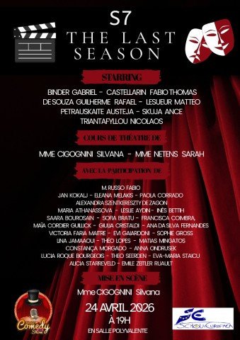 Entitled ‘The Last Season’, the show will consist of a patchwork offering a glimpse of the work carried out throughout the year by the S7 pupils.  You will enjoy scenes from classical (Molière) and absurdist theatre, stand-up comedy, slam poetry, musical performances, and even a reimagining of a film clip. These various performances will be introduced by sketches created and performed by the S1 and S2 theatre pupils.